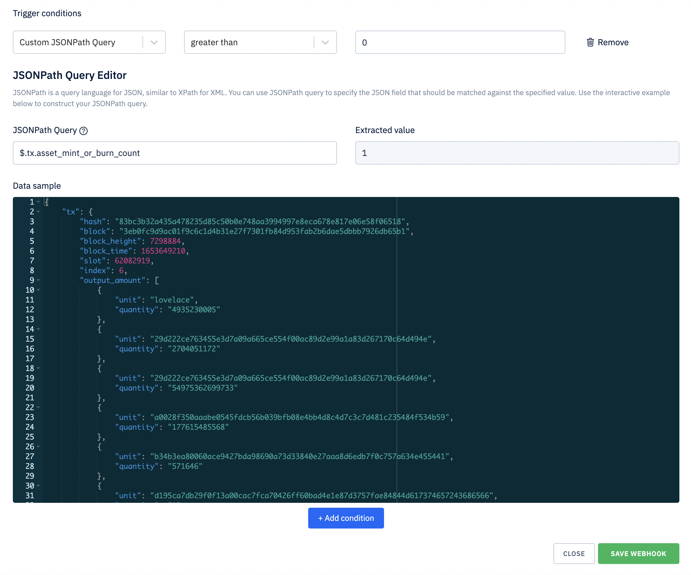 Optionally, you can create up to 5 trigger conditions for a webhook. Only events that meet all of the conditions will be sent to your endpoint. A condition rule consist of a field, a value, and an operator. You can choose from predefined condition fields or create a custom JSONPath query extracting the field you want to match.